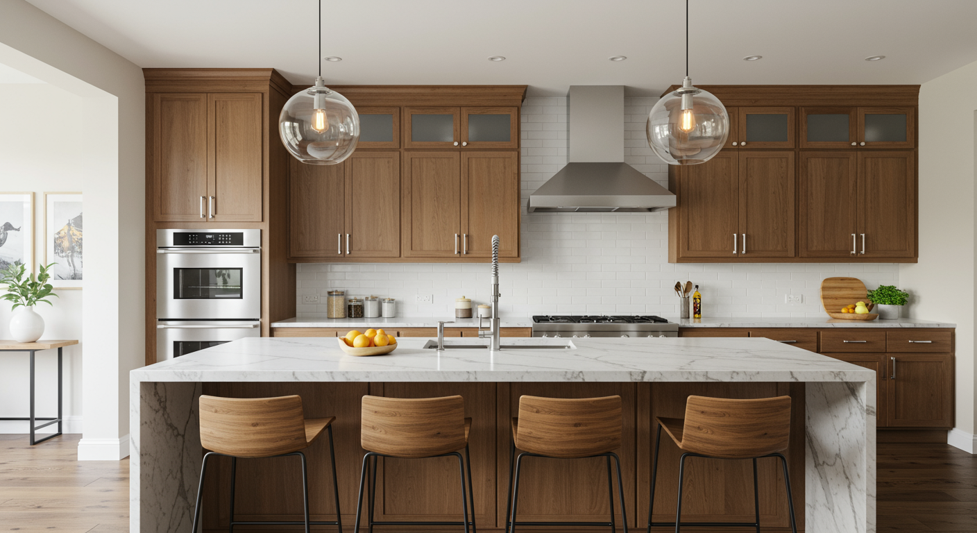 If you're looking for more of a luxurious feel, marble and granite for countertops and backsplashes are always classic choices, though quartzite is also a very durable and popular material. Stainless steel is another popular option for those who want a modern look.