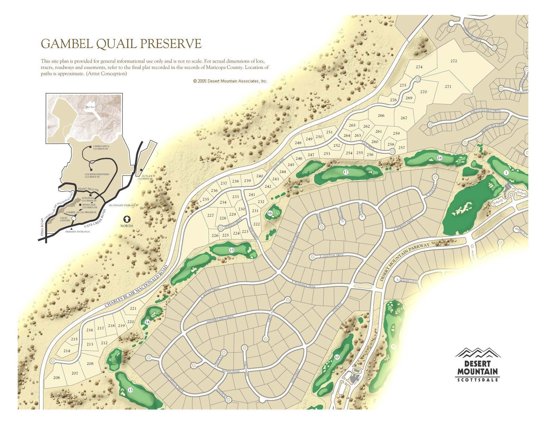 Rolling terrain surrounds the lots of Gambel Quail Preserve, providing residents with impeccable views. In addition, vantage points provide picturesque sightings of the finishing holes of the Renegade Golf Course, Sonoran Desert, city lights, and Lone Mountain.