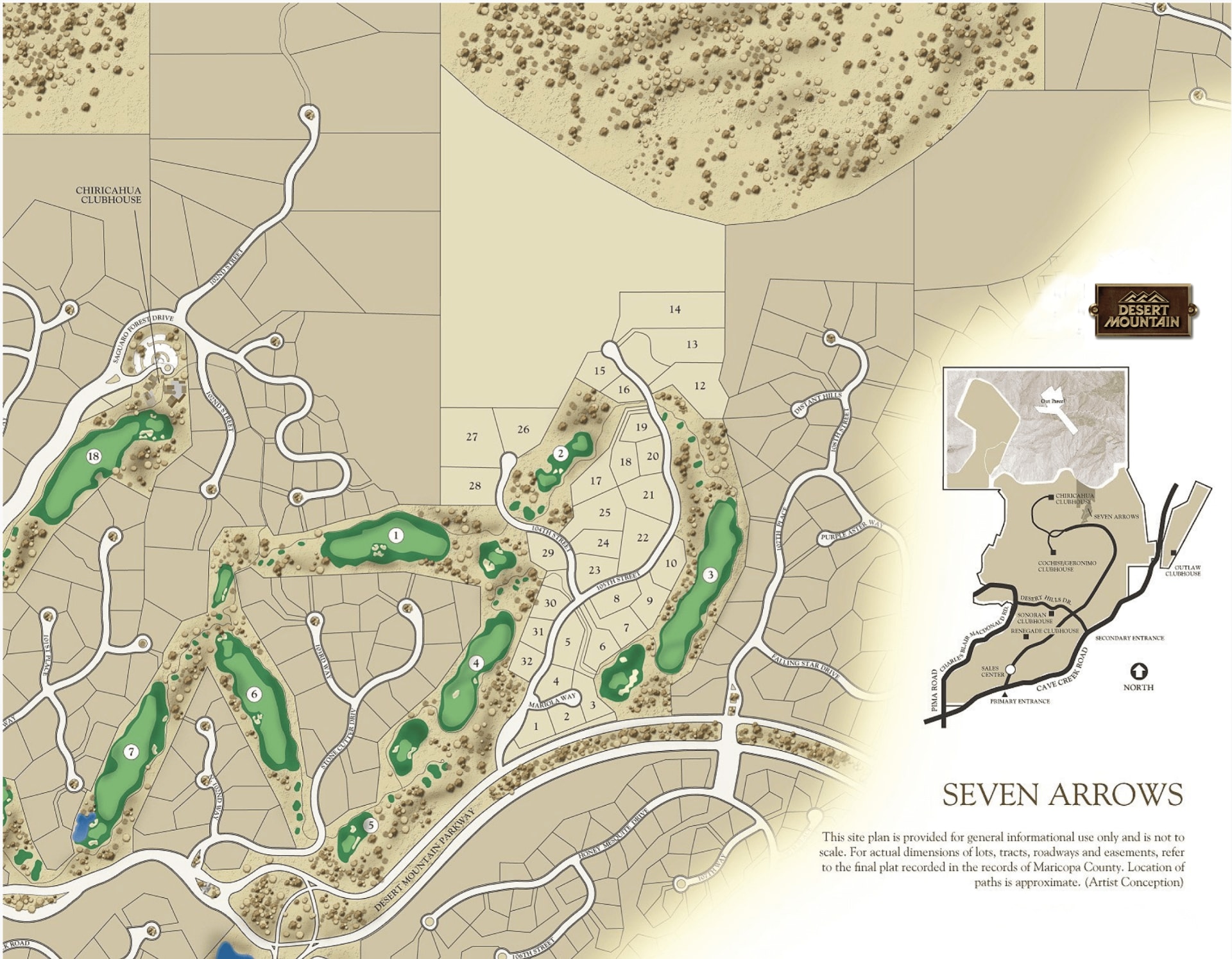 Seven Arrows is an intimate village located above the second, third, and fourth holes of the Chiricahua Golf Course. The luscious fairways and greens of the course, along with the spectacular views of the high desert draw homeowners to the area. Residents start and end their days with beautiful sunrise and sunset views with the backdrop of the Apache Mountain and distant cityscape.